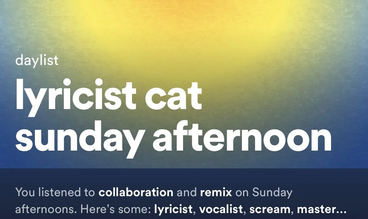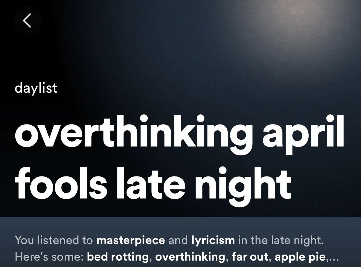 Here are just a few of the daylist titles I have had over the past few weeks that have made me laugh: